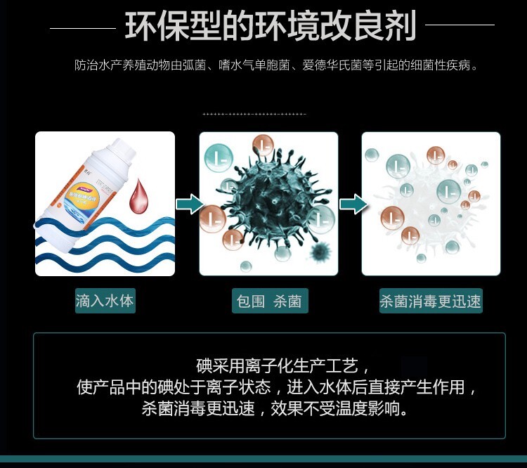 聚維酮碘為廣譜消毒劑,對大部分細菌、真菌和病毒等均有不同程度的殺滅作用。主要用于魚卵、水生動物體表消毒;同時對病毒有不同程度的殺滅作用。