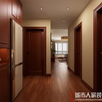 從入戶門處看,無論是門窗還是柜體的選擇,從造型和色彩兩方面都展露出新中式的特有風(fēng)格特點,既有古典中式的中規(guī)中矩又有現(xiàn)代簡約的簡潔明了。