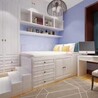 兒童房的布置也可以稱得上是別出心裁,受面積以及功能需求所限,靠墻一側的柜子和床貼的比較近,所以在做床鋪臺階的時候刻意縮短了一些,方便推拉衣柜的底層抽屜。房間的另一半自然是用來當做孩子的活動區(qū)域和學習場所了,整屋的家具都是白色為主,白色是能給孩子留下想象空間的色彩了!