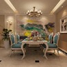 餐廳的裝飾布置也是比較引人注目的,頂面沒有采用復(fù)雜的造型做法,只是在兩邊做了簡(jiǎn)單的邊吊,中間自然還是懸掛著歐式造型暖光燈,客廳里面的造型墻做的相當(dāng)出色,既有油畫的色彩又有山水畫的意境,兼而有之,意境深遠(yuǎn)。餐廳桌椅的都是典型的歐式造型,墻頂?shù)孛嫔式咏?,融合感很?qiáng)。